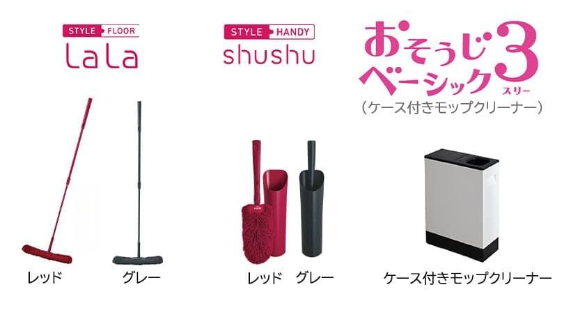 ララで床はもちろん、家具の下や隙間も、かる~くひと拭き シュシュで机や棚の上の小物の隙間など気になったらシュシュっとひと拭き モップで集めたゴミやモップに付いたホコリはクリーナーに吸わせてお掃除終了!